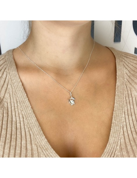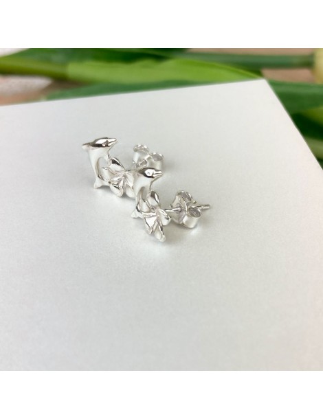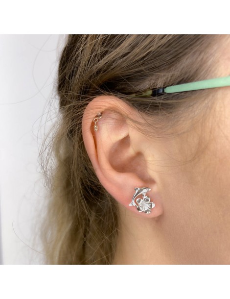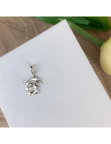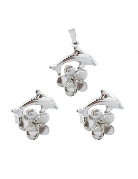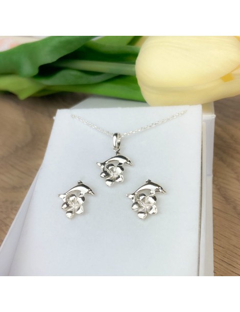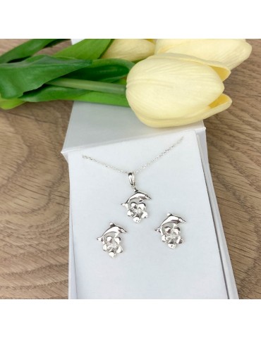 Zabawny komplet dziecięcej, oksydowanej biżuterii składającej się z kunsztownie wykonanych kolczyków i wisiorka, przedstawiających delfinka z kwiatkiem. Zestaw wykonano z wysokiej jakości srebra o próbie 925. Kolczyki zostały wyposażone w zapięcie typu sztyft z barankiem.