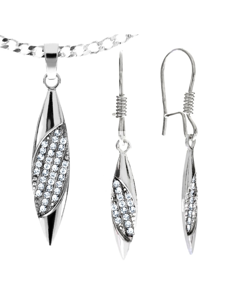 Elegancki komplet biżuterii wykonany ze srebra próby 925, składający się z wisiorka i kolczyków. Smukły, podłużny kształt elementów subtelnie wydłuża szyję i rozświetla twarz. Każdy element zdobiony jest lśniącymi, białymi cyrkoniami, które pięknie odbijają światło, tworząc efekt luksusu i delikatnej elegancji. Biżuteria idealna zarówno do codziennych stylizacji, jak i na wyjątkowe okazje.