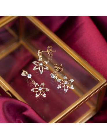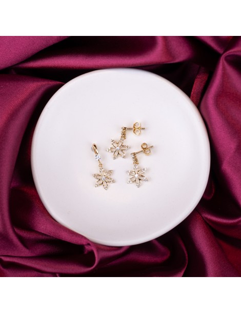 Delikatny komplet KWIATEK ,składający się z wisiorka i kolczyków. Wykonany z żółtego, 8 karatowego złota (próba 333), zdobiony białymi, drobnymi cyrkoniami. REALIZACJA W CIĄGU 48H!