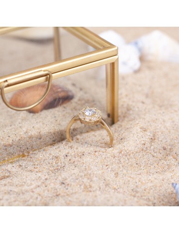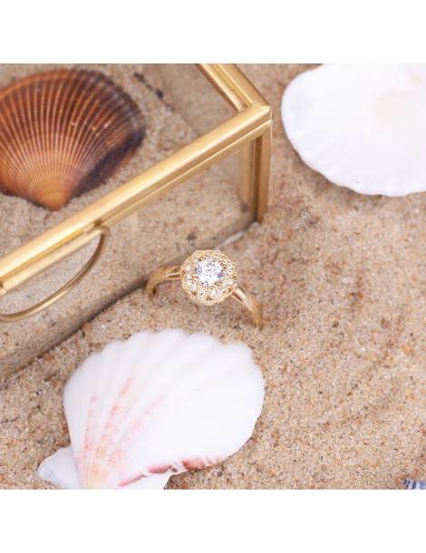 Zmyslowy pierścionek wykonany z niezwykłą precyzją i dbałością o każdy szczegół. Okrągłą, przestrzenną koronę zdobi przepiękna kwiat, w którym zakuto liczne, białe cyrkonie. Centralnie zakuta ma średnicę 5mm. Boki pierścionka zdobi piękny ażurowy wzór. Całość tworzy cudowną kompozyjcę wykonaną z żółtego, 14 karatowego złota (próba 585). Gładki poler nadaje pierścionkowi pięknego połysku.