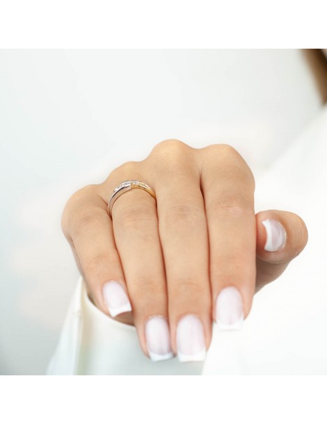 Przeplatająca się forma obrączki z jasnym akcentem nadaje modelowi nowoczesnego charakteru i sprawia, że pierścionek wyróżnia się na tle klasycznych wzorów. To detal, który podkreśla lekkość projektu i jego biżuteryjną finezję.
