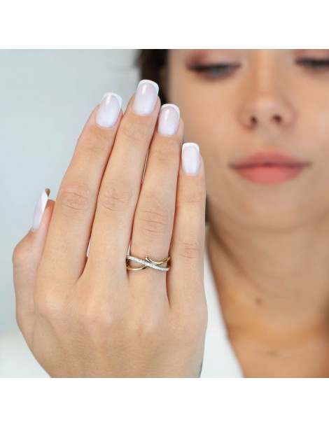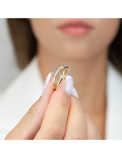 Ślicznie mieniący się, ażurowy pierścionek ozdobny wysadzany licznymi, drobnymi cyrkoniami w białym kolorze. Finezyjny kształt nadaje mu nowoczesnego wyglądu. Wykonany jest w całości z żółtego złota próby 585. Dzięki polerowanym powierzchniom pierścionek cechuje się niezwykłym blaskiem.