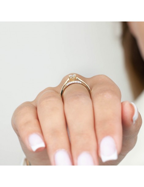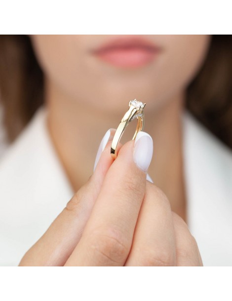 Elegancki pierścionek z kolekcji Solitaire wykonany w całości z żółtego złota próby 585, ozdobiony centralnie osadzoną białą cyrkonią. Dodatkowym atutem modelu jest subtelny wieniec drobnych cyrkonii umieszczonych pod kamieniem, który pięknie podkreśla jego blask i nadaje całości bardziej biżuteryjny charakter. Smukła, gładka obrączka zapewnia wygodę noszenia i elegancką prezencję na dłoni. To idealne połączenie klasycznej formy solitaire z delikatnym, ozdobnym akcentem.