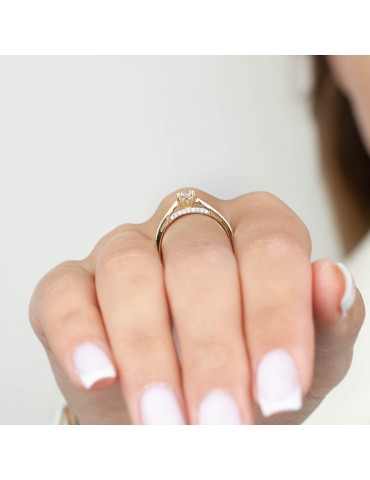 Ukryty pod kamieniem wieniec cyrkonii subtelnie wzbogaca klasyczną formę pierścionka, dodając mu lekko biżuteryjnego charakteru bez utraty eleganckiej prostoty. Smukła, gładka obrączka sprawia, że pierścionek jest wygodny w codziennym noszeniu i pięknie układa się na dłoni.