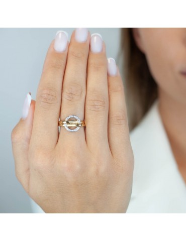 Złoty pierścionek próby 585 z dekoracyjnym, okrągłym elementem wysadzanym białymi cyrkoniami oraz przeplatającą się szyną. Model z kolekcji Luna Disc wyróżnia się nowoczesną, dynamiczną formą i subtelnym efektem halo. Rodowanie na biało podkreśla blask kamieni, nadając całości elegancki i wyrazisty charakter.