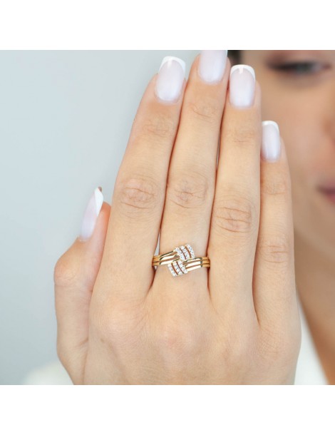 Intrygujący asymetryczny, ażurowy pierścionek wykonany ze złota próby 585. Szyna pierścionka rozdziela się na trzy części, których końce ozdobiono poprzecznymi pasami pokrytymi białym rodem i wysadzanymi cyrkoniami. Zdobienie przepięknie igra ze światłem i podkreśla urodę kobiecych dłoni.