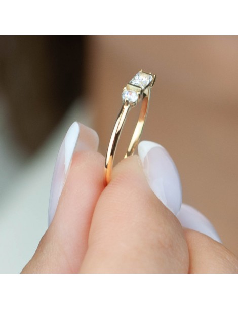 Nowoczesny pierścionek z kolekcji Trinity wykonany z żółtego złota próby 585, ozdobiony trzema białymi cyrkoniami. Centralny kamień w szlifie prostokątnym nadaje całości wyrazisty, geometryczny charakter, a dwie okrągłe cyrkonie po bokach subtelnie równoważą kompozycję. Prosta, elegancka linia obrączki podkreśla nowoczesny styl modelu, a kontrastowe, jasne elementy oprawy eksponują blask kamieni. Motyw trzech kamieni symbolizuje przeszłość, teraźniejszość i przyszłość, czyniąc ten pierścionek wyjątkowym wyborem na zaręczyny lub ważny prezent.