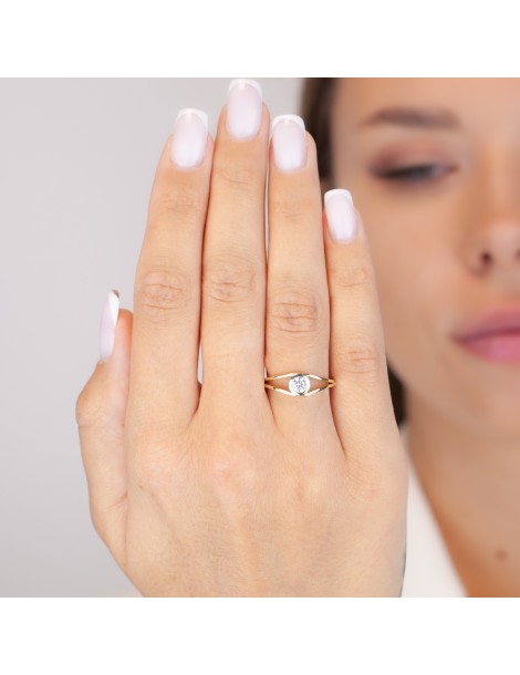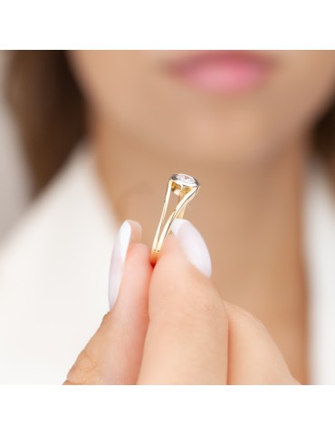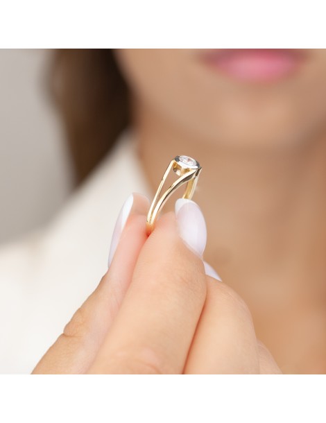 Pierścionek wykonany został w całości z żółtego złota próby 585 (14K), co gwarantuje trwałość i ponadczasowy charakter. Oprawa kamienia została poddana rodowaniu na biało, dzięki czemu cyrkonia zyskuje intensywniejszy blask i wyraźny kontrast względem złota.