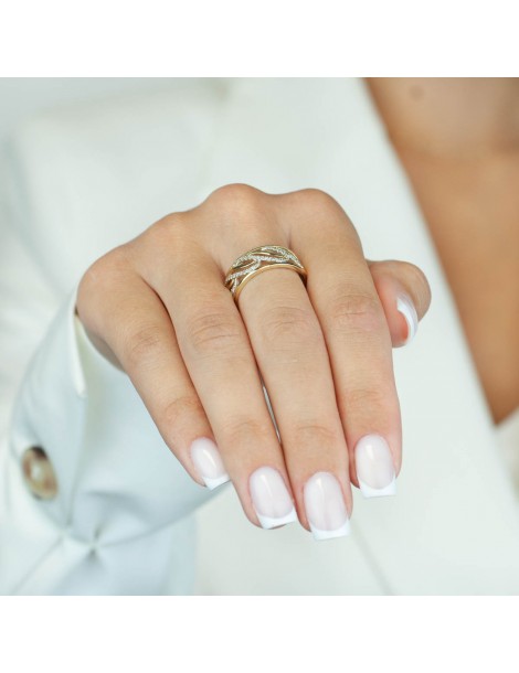 Stylowy pierścionek z 14-karatowego złota (próba 585). Szeroki, o ażurowej, misternie wykonanej konstrukcji inspirowanej wzorem morskich fal. Poszczególne pasma są dodatkowo pokryte białym rodem i wysadzane białymi cyrkoniami, co tworzy pięknie połyskujący, dwukolorowy efekt. Cała kompozycja ślicznie połyskuje i przyciąga wzrok.