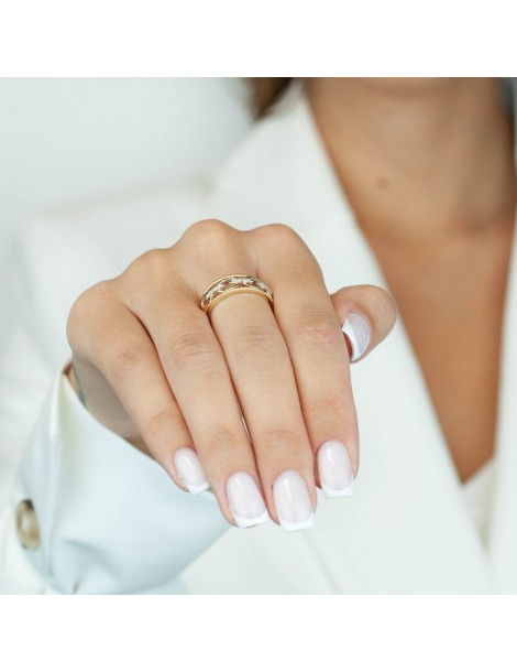 Nowoczesny, misternie zdobiony pierścionek o szerokiej koronie. Wykonany z 14-karatowego złota (żółte złoto próby 585) i wysadzany drobnymi, białymi cyrkoniami. Krawędzie pierścionka zostały zdobne efektowną granulacją, która ślicznie migocze. Centralne paski z cyrkoniami zostały dodatkowo pokryte białym rodem, co podkreśla blask kamieni. Cała kompozycja wygląda bardzo elegancko i doda stylu każdej stylizacji.