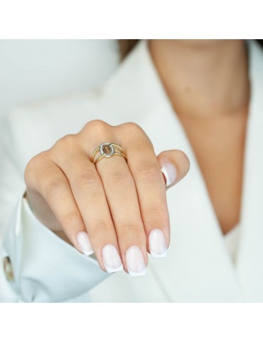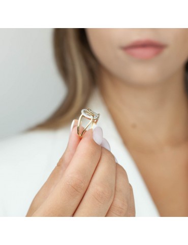 Połyskujący pierścionek ze złota próby 585, o nowoczesnym kształcie. Z koroną w postaci przeplecionego owalu wysadzanego cyrkoniami. Starannie wykonany z najlepszej jakości materiałów, polerowany na wysoki połysk. Ten elegancki pierścionek stanowi świetny dodatek do biurowej stylizacji, idealnie nada się do noszenia zarówno do pracy jak i na większe wyjścia.