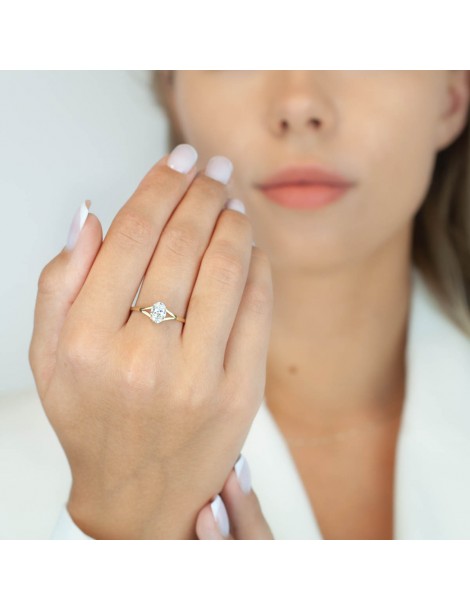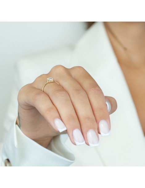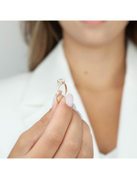 Pierścionek wykonany jest z żółtego złota próby 585, co zapewnia trwałość, wysoką jakość oraz piękny, szlachetny kolor. Centralna cyrkonia o owalnym szlifie została osadzona w klasycznej czterokrapkowej oprawie, która stabilnie trzyma kamień i pozwala światłu wydobywać jego blask. Mniejszy rozmiar kamienia sprawia, że całość wygląda niezwykle elegancko i bardzo proporcjonalnie.