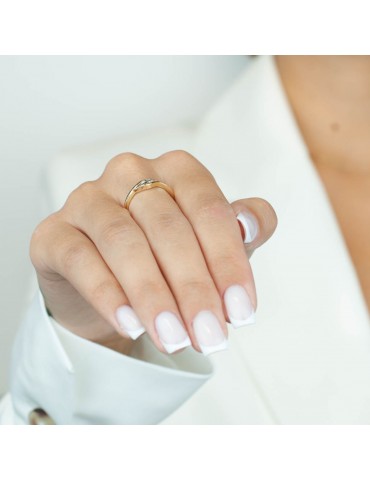 Prezentujemy Państwu nasz nowoczesny i elegancki pierścionek wykonany z 14-karatowego złota próby 585. Zdobią go dwie białe cyrkonie, które dodają mu blasku i ślicznie migoczą przy każdym ruchu dłoni. Korona pierścionka została zaprojektowana na kształt fal, co nadaje całej kompozycji unikalnego i wyjątkowego charakteru. Dzięki temu nasz pierścionek wyróżnia się na tle innej biżuterii i z pewnością przyciągnie uwagę każdej osoby.