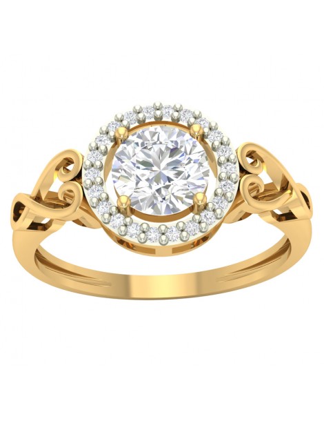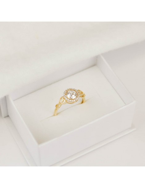 Złoty pierścionek próby 585 z dużą, centralną białą cyrkonią otoczoną oprawą typu halo oraz dekoracyjnymi ramionami w formie subtelnych serc. Model z kolekcji Luna Disc łączy romantyczny charakter z eleganckim blaskiem. Rodowanie na biało podkreśla cyrkonie, nadając biżuterii wyrazisty i luksusowy wygląd.