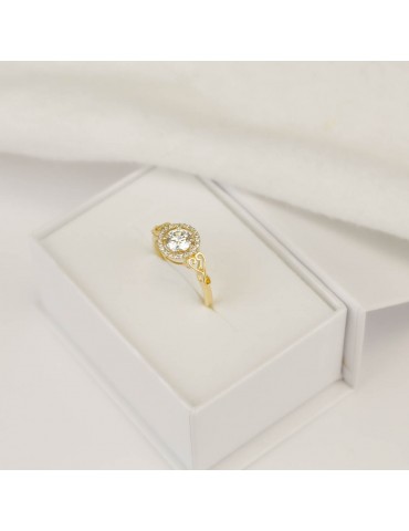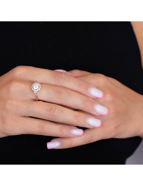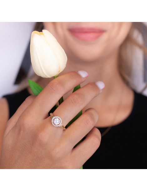 Centralna biała cyrkonia została otoczona drobnymi kamieniami tworzącymi oprawę typu halo, która optycznie powiększa kamień i wzmacnia jego połysk. Dzięki temu pierścionek przyciąga uwagę i pięknie odbija światło.