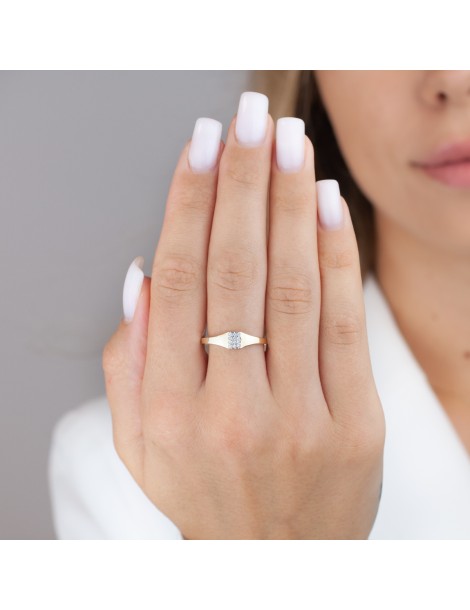 Subtelny i elegancki złoty pierścionek damski wykonany w całości z żółtego złota próby 585 (14K), należący do kolekcji Lady Signet. Model Velora wyróżnia się minimalistyczną formą z prostokątną powierzchnią zdobioną drobnymi białymi cyrkoniami. Kamienie zostały osadzone w rodowanej na biało oprawie, co podkreśla ich blask oraz tworzy elegancki kontrast z ciepłym odcieniem złota. Delikatna, lekko zwężająca się obrączka sprawia, że pierścionek jest bardzo komfortowy w noszeniu. To nowoczesna biżuteria o eleganckim charakterze, idealna zarówno do codziennych stylizacji, jak i na wyjątkowe okazje.