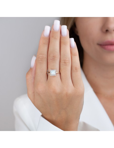 Model Lumina z kolekcji Gem Square zachwyca elegancką, wyrazistą kompozycją i subtelną grą barw. Centralny opal syntetyczny w kwadratowej formie przyciąga wzrok opalizującą strukturą, która mieni się delikatnymi refleksami w zależności od kąta padania światła.
