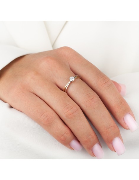 Ponadczasowy pierścionek zaręczynowy wykonany z żółtego złota próby 585. Jego centralnym punktem jest lśniąca cyrkonia osadzona w czteroramiennej koronie, która pięknie eksponuje kamień, nadając mu wyjątkowego blasku. Delikatne, smukłe linie obrączki zostały wzbogacone o element pokryty białym rodem, co dodaje całości elegancji i nowoczesności. To model, który symbolizuje czystość uczuć i trwałość miłości – idealny wybór na zaręczyny. Autentyczność złota potwierdza cecha probiercza gdańskiego urzędu probierczego oraz imiennik producenta. Pierścionek zapakowany jest w eleganckie pudełko z logo firmy, gotowy do wręczenia.