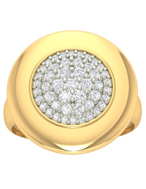 Prezentowany sygnet damski z żółtego złota próby 585 to wyjątkowy pierścionek, który zachwyca swoim wyrazistym designem. Centralna, okrągła tarcza wypełniona została dziesiątkami drobnych cyrkonii, których blask dodatkowo podkreślono warstwą białego rodu. Efekt ten sprawia, że całość pięknie odbija światło, dając efekt luksusowego, diamentowego połysku.