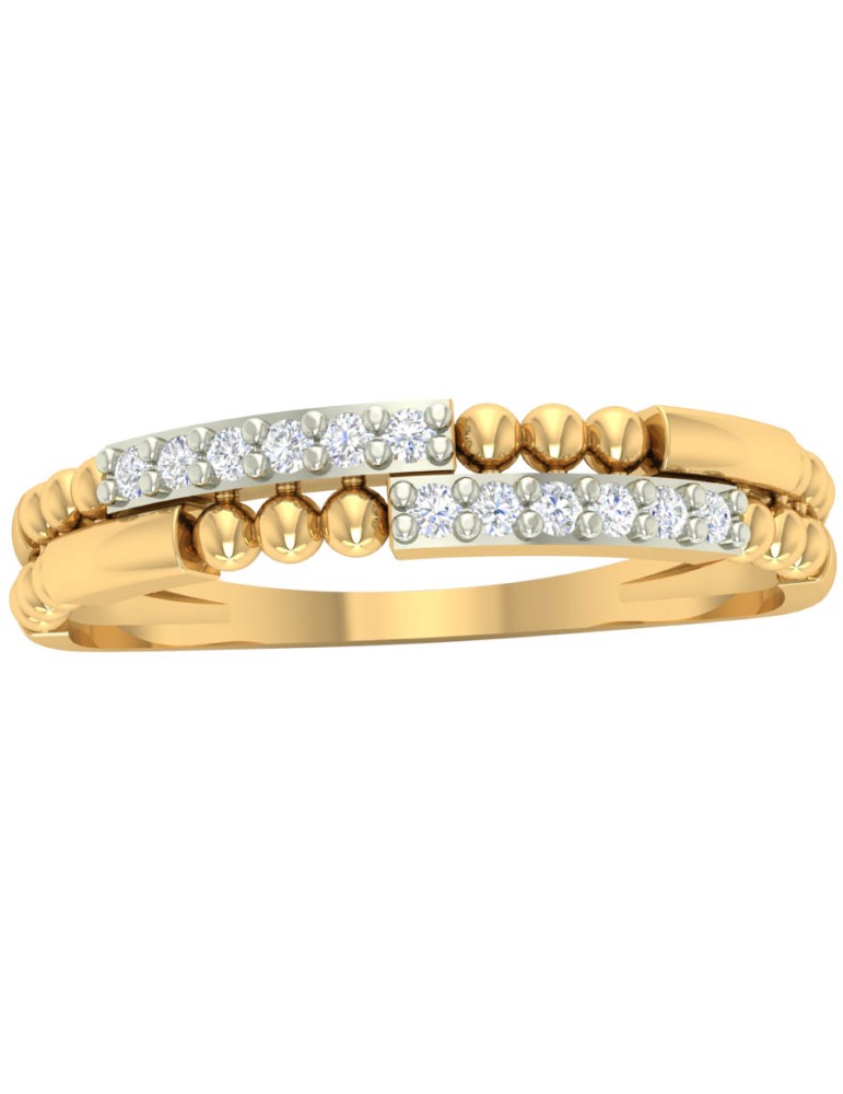 Złoty pierścionek próby 585 (14K) z kolekcji Ornella o nowoczesnej, dwupasmowej formie. Dwa równoległe elementy zdobione są białymi cyrkoniami osadzonymi w białym rodowaniu, a pomiędzy nimi znajdują się dekoracyjne, polerowane kulki z żółtego złota. Kompozycja tworzy elegancki kontrast i wyrazisty, uporządkowany design.