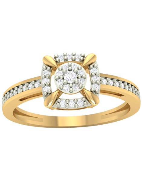 Złoty pierścionek próby 585 z geometryczną kompozycją cyrkonii łączącą formę okręgu i kwadratu. Centralny motyw został otoczony kamieniami w stylu halo, a zdobiona szyna dodaje całości blasku. Rodowanie na biało podkreśla kontrast i elegancję modelu.