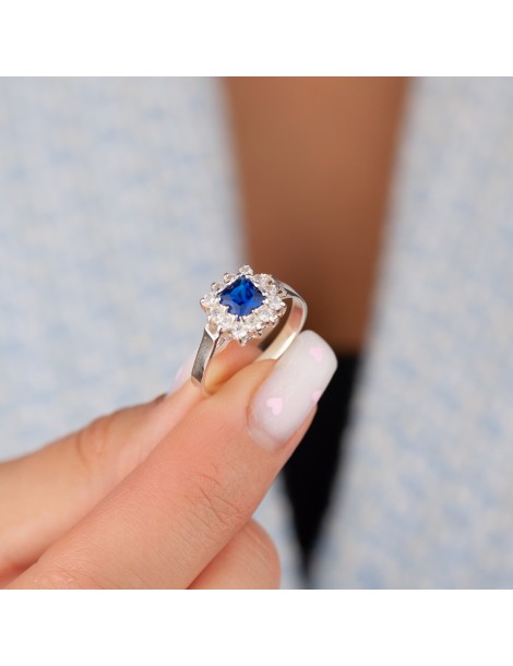 Elegancki pierścionek wykonany ze srebra o wysokiej próbie 925. Udekorowany w centralnej części pięknie błyszczącym kamieniem o wymiarach 5 x 5 milimetrów, otulonym ślicznie połyskującymi białymi cyrkoniami. Centralny kamień występuje w czterech wersjach kolorystycznych do wyboru: czarnej, rubinowej, szafirowej i białej. Tą unikalną ozdobę znaleźć można również, wraz z kolczykami i wisiorkiem, w zestawie lśniącej biżuterii.