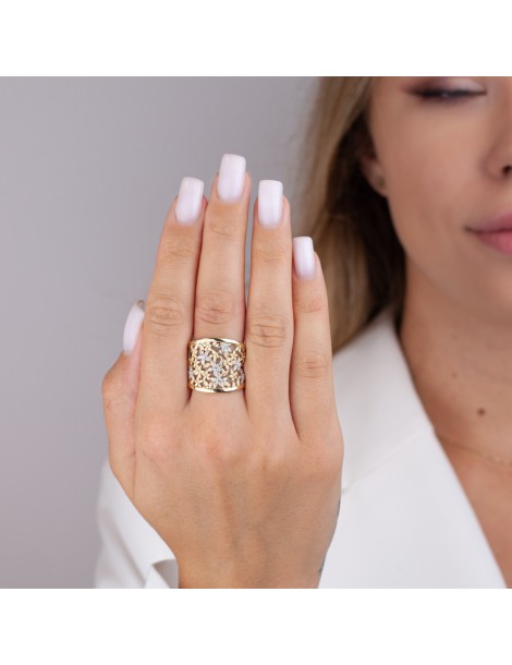 Efektowny pierścionek z kwiecistym motywem, wykonany z żółtego złota próby 333. Wysadzany licznymi białymi cyrkoniami, z elementami pokrytymi rodem dla dodatkowego blasku. Regulowany rozmiar 15–18 zapewnia idealne dopasowanie.