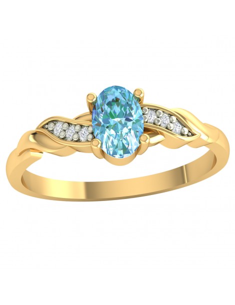 Elegancki pierścionek zaręczynowy zdobiony akwamarynem syntetycznym w kształcie owalu o wymiarach 6x4mm.