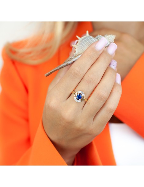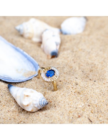 Złoty pierścionek wyróżniający się niezwykłą elegancją. Jego okazała, owalna korona zdobiona została po bokach wzorem greckim. Dzięki pięknie mieniącemu się szafirowi syntetycznemu na pewno nie pozostanie niezauważony. Dodatkowego efektu nadają mu białe cyrkonie, które pokryte zostały białym rodem.