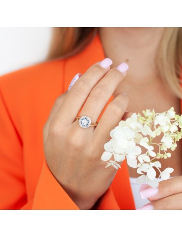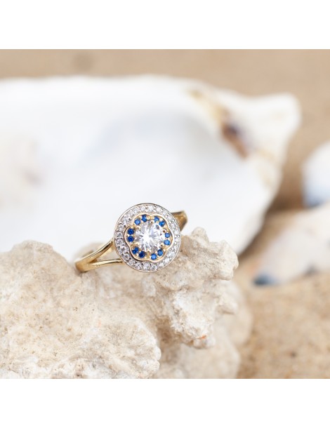 Złoty pierścionek próby 585 z centralną białą cyrkonią o średnicy 5 mm, otoczoną szafirami syntetycznymi oraz białymi cyrkoniami w oprawie typu halo. Model z kolekcji Luna Disc zachwyca kontrastem głębokiego błękitu i świetlistej bieli. Elegancka kompozycja kamieni nadaje biżuterii luksusowy i ponadczasowy charakter.