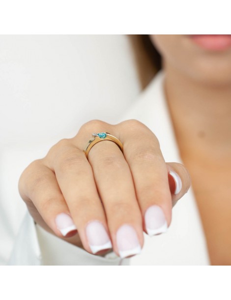 Zmysłowy pierścionek zaręczynowy zdobiony centralnie piękną błękitną cyrkonią, po boku której zakuto drobne białe cyrkonie. Pierścionek wykonany jest w całości z żółtego, 14 karatowego złota, próba 585. Polerowane powierzchnie nadają mu pięknego połysku.