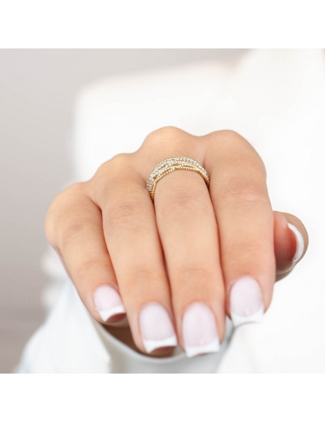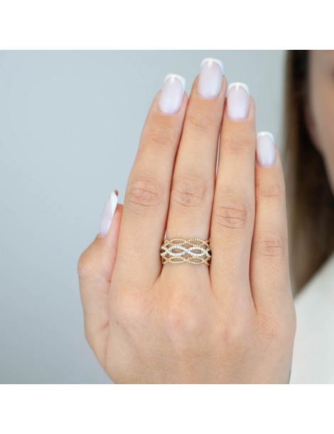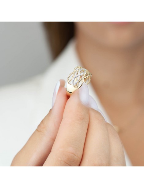 Ażurowy, wręcz koronkowy pierścionek przybierający formę przeplatających się pasów z 14-karatowego złota. WARKOCZ . Zewnętrzne linie naśladują przeploty misternego sznura. Wewnętrzna część jest kunsztownie wysadzana białymi cyrkoniami, których blask podkreślono rodowaną powłoką.