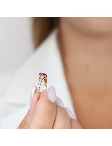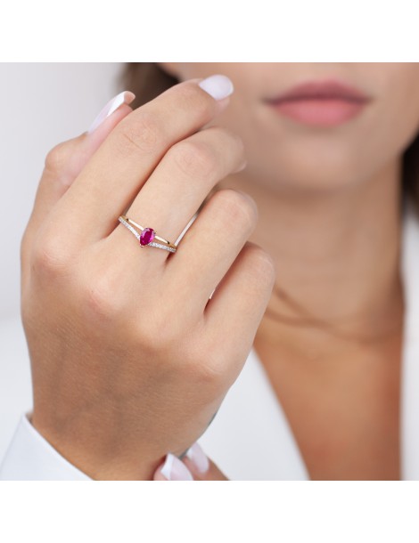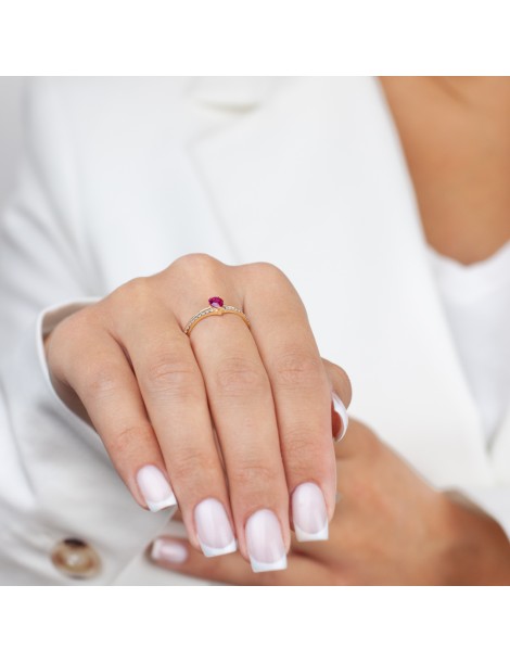 Wyjątkowy pierścionek z rubinowym kamieniem symbolizującym miłość pełną pasji. Wykonany z 14-karatowego złota, został dodatkowo ozdobiony rodowanym pasem wysadzanym białymi cyrkoniami. Pełen nieziemskiego blasku, to idealny pierścionek zaręczynowy, w którym zaklęto ogrom gorących emocji.