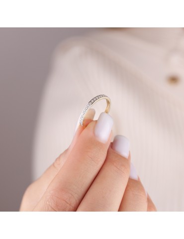 Delikatny pierścionek wykonany z 14-karatowego złota wyłożony cyrkoniami. Cyrkonie umieszczone do połowy obwodu pierścionka, ślicznie się błyszczą co daje magiczny efekt. Dzięki temu że pierścionek nie posiada wystających elementów świetnie sprawdzi się na co dzień.
