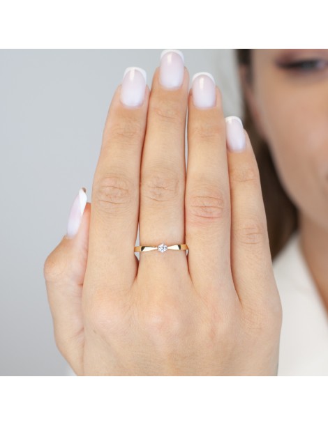 Pierścionek został wykonany z żółtego złota próby 585, które zapewnia trwałość i szlachetny wygląd na lata. Oprawa typu solitaire została zaprojektowana tak, aby maksymalnie wyeksponować cyrkonię i pozwolić jej pięknie odbijać światło, zachowując jednocześnie subtelny i harmonijny charakter całej formy.
