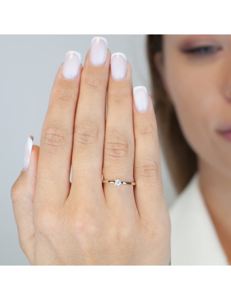 Pierścionek wykonano z żółtego złota próby 585, co zapewnia trwałość i piękny, szlachetny odcień. Minimalistyczna oprawa typu solitaire została zaprojektowana tak, aby wyeksponować cyrkonię i pozwolić jej efektownie odbijać światło, jednocześnie zachowując delikatny, dyskretny charakter.