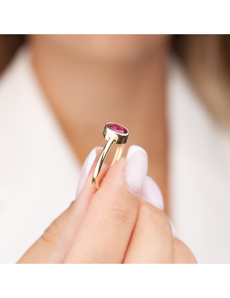Klasyczny pierścionek zaręczynowy, który zachwyca prostotą i siłą wyrazu. Wykonany z żółtego złota próby 585, ozdobiony został dużym, syntetycznym rubinem o owalnym szlifie. Kamień osadzono w minimalistycznej oprawie, która podkreśla jego intensywną, ognistą barwę. Blask rubinu symbolizuje miłość, pasję i oddanie – idealnie oddaje charakter zaręczyn lub innej wyjątkowej okazji. To ponadczasowa propozycja dla kobiety, która ceni klasykę, ale lubi też mocne akcenty w biżuterii. Pierścionek, który mówi więcej niż słowa.