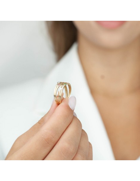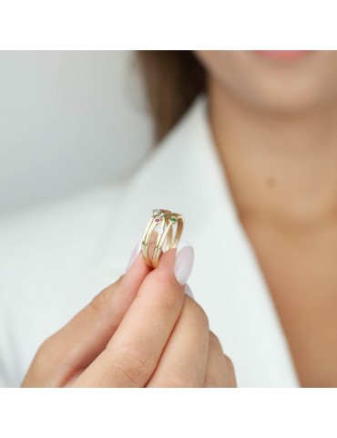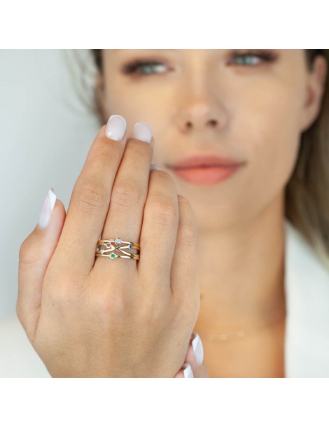 Szeroki pierścionek z przeplataną, ażurową koroną. Wykonany w całości z polerowanego, żółtego złota próby 585. Zdobiony pięcioma barwnymi kamieniami, szafirem, szmaragdem i rubinem syntetycznym oraz białymi cyrkoniami. Ten wyjątkowy pierścionek olśniewa swoim złoto-tęczowym blaskiem!