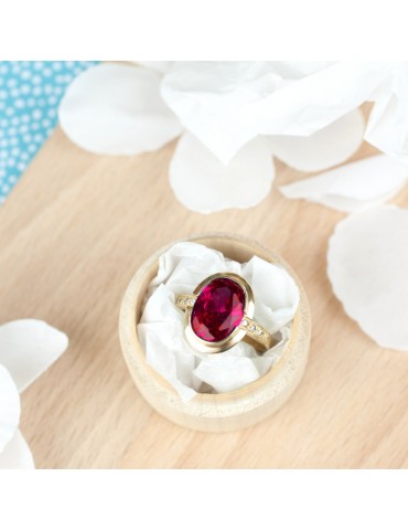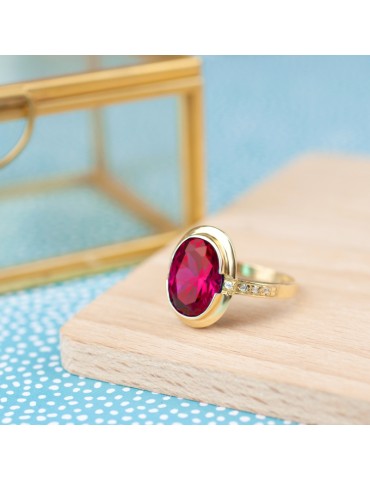 ZŁOTY PIERŚCIONEK 585 Z RUBINEM STYNTETYCZNYM 10×13 MM I BOCZNYMI CYRKONIAMI