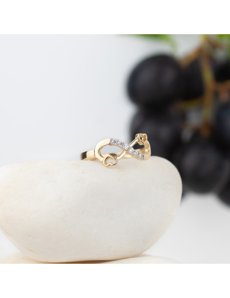Symbol nieskończoności został dodatkowo ozdobiony rzędem białych, lśniących cyrkonii, które pięknie odbijają światło i nadają biżuterii delikatnego blasku. Połączenie złota i połyskujących kamieni sprawia, że pierścionek prezentuje się subtelnie, ale wyraźnie przyciąga spojrzenia.