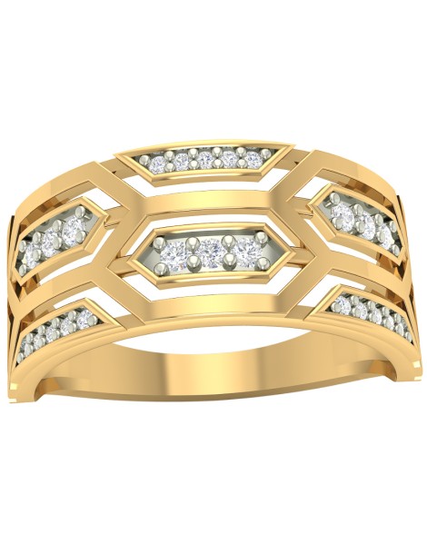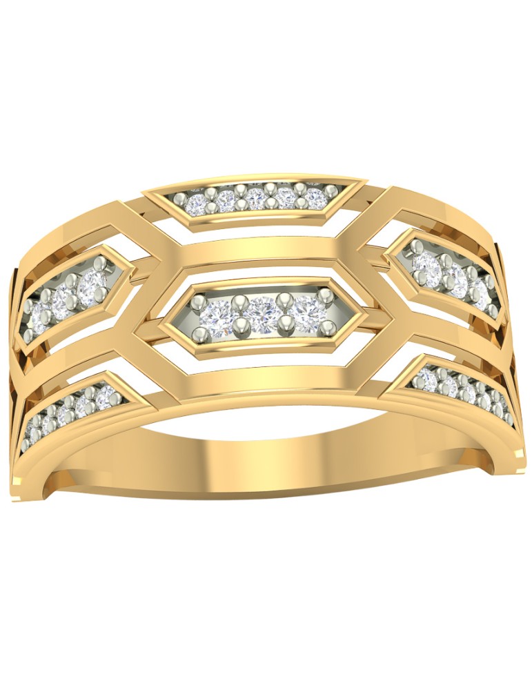 Nowoczesny pierścionek z żółtego złota próby 585, zdobiony geometrycznym ażurowym wzorem i białymi cyrkoniami. Idealne połączenie elegancji i odważnego designu – dla kobiet, które chcą wyróżniać się wyjątkową biżuterią.