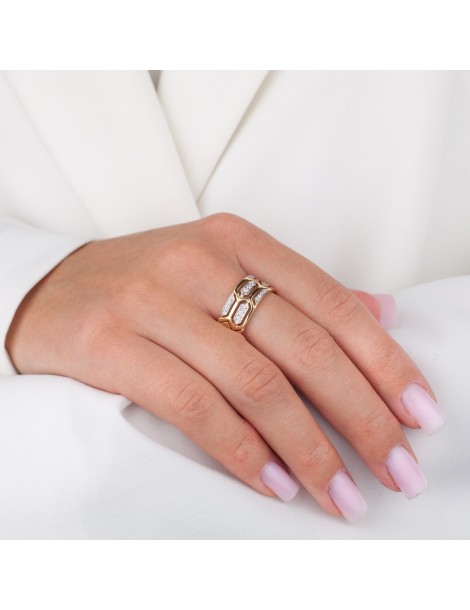 Całość zdobią starannie oprawione białe cyrkonie, które przepięknie połyskują przy każdym ruchu dłoni. Subtelny kontrast żółtego złota i jasnych kamieni nadaje pierścionkowi luksusowego charakteru, a jednocześnie zachowuje lekkość i elegancję.