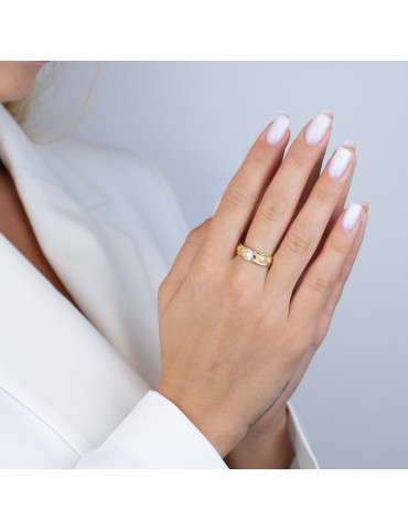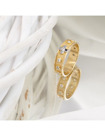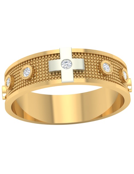 Pierścionek z żółtego złota próby 585 to wyjątkowy model, który łączy w sobie elegancję i głębokie znaczenie symboliczne. Szeroka szyna ozdobiona została delikatną fakturą z drobnych, regularnie rozmieszczonych kuleczek, co nadaje całości niepowtarzalnej struktury i sprawia, że biżuteria prezentuje się bardzo oryginalnie. Wśród zdobień rozmieszczono połyskujące cyrkonie, które pięknie odbijają światło i dodają pierścionkowi blasku. Centralnym elementem kompozycji jest krzyż wykonany z białego złota, ozdobiony dodatkowo cyrkonią, dzięki czemu całość nabiera głębszego znaczenia i wyróżnia się spośród innych modeli.