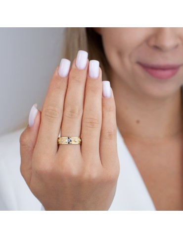 Unikalny design pierścionka sprawia, że doskonale komponuje się zarówno z codziennymi stylizacjami, jak i z elegancką garderobą. Złoto próby 585 połączone z połyskiem cyrkonii i kontrastem białego złota nadaje mu ponadczasowego charakteru.