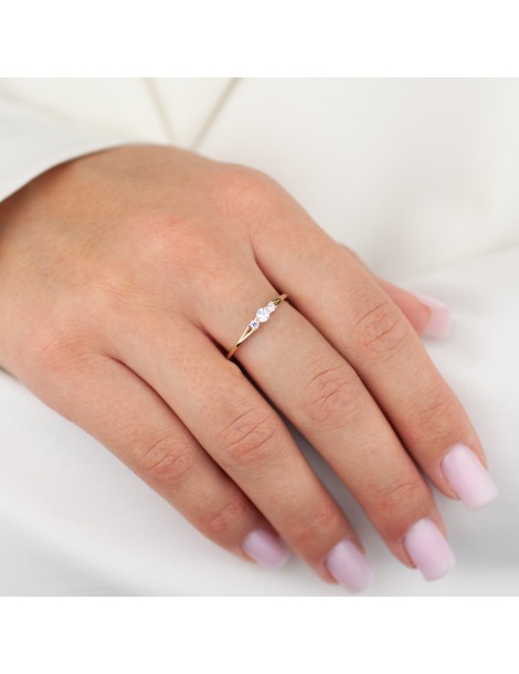 Pierścionek wykonany jest z żółtego złota próby 585 (14 karatów). Zdobiony trzema białymi cyrkoniami, które pięknie odbijają światło i podkreślają elegancki charakter biżuterii. Jasne elementy oprawy są wykończone dekoracyjną warstwą białego rodu, co dodaje całości nowoczesnego kontrastu.