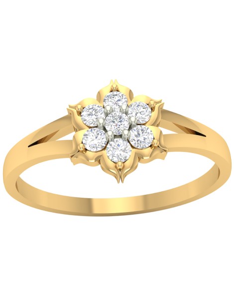 Pierścionek w kształcie kwiatka z płatkami to prawdziwe jubilerskie dzieło sztuki. Centralnym punktem kompozycji jest siedem cyrkonii osadzonych tak, aby tworzyły subtelną rozetę. Dookoła nich znajdują się stylizowane złote „płatki”, które dodają głębi i podkreślają florystyczny charakter pierścionka. Dzięki temu całość przypomina maleńki, lśniący kwiat zaklęty w złocie.