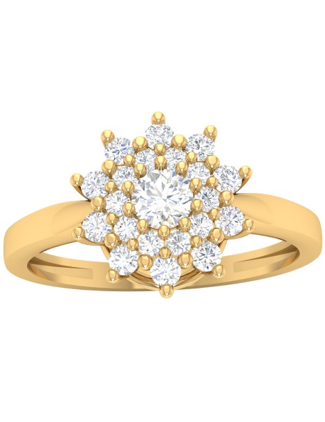 Zjawiskowy pierścionek wykonany z żółtego złota próby 585, ozdobiony bogatą kompozycją cyrkonii. W centrum umieszczono większy kamień, który otaczają dwie warstwy drobniejszych, precyzyjnie oprawionych cyrkonii. Układ ten tworzy efekt pełnego, rozkwitającego kwiatu, mieniącego się w każdym świetle. Złoto o ciepłym odcieniu pięknie podkreśla blask kamieni, nadając całości luksusowy i elegancki charakter. Pierścionek ten to idealny wybór na zaręczyny, rocznicę lub prezent, który wyrazi miłość i podziw w wyjątkowy sposób.