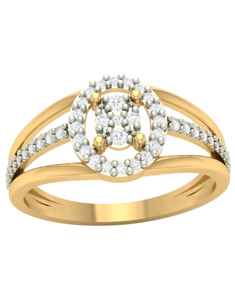 Złoty pierścionek próby 585 z dekoracyjną, okrągłą kompozycją cyrkonii w formie halo. Centralny motyw został subtelnie podkreślony dodatkowymi kamieniami oraz zdobioną szyną. Rodowanie na biało wydobywa blask cyrkonii, tworząc elegancki kontrast z żółtym złotem.