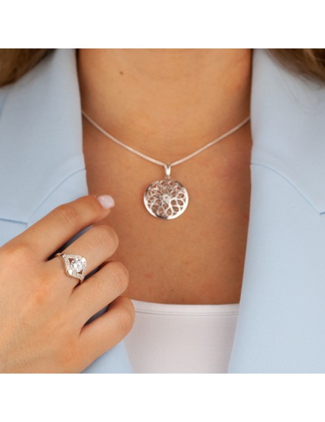 Elegancki wisiorek przestrzenny w kształcie koła to świetne dopełnienie każdej stylizacji. Idealnie sprawdzi się na co dzień, ale i na wielkie wyjścia. W centralnym punkcie kompozycji zostało umieszczone wysadzane cyrkoniami koło. Pomiędzy kołem a ramą kolczyków znajduje się misternie wykonany wzór kształtem przypominającym wstęgę.